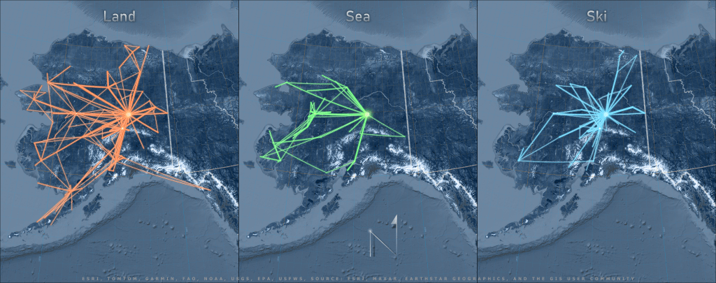 This blog post talks about the cartographic principles and GIS workflow behind creating this map of Alaska air routes with real-life* flight data from a fixed wing using wheeled gear, floats, or skis.