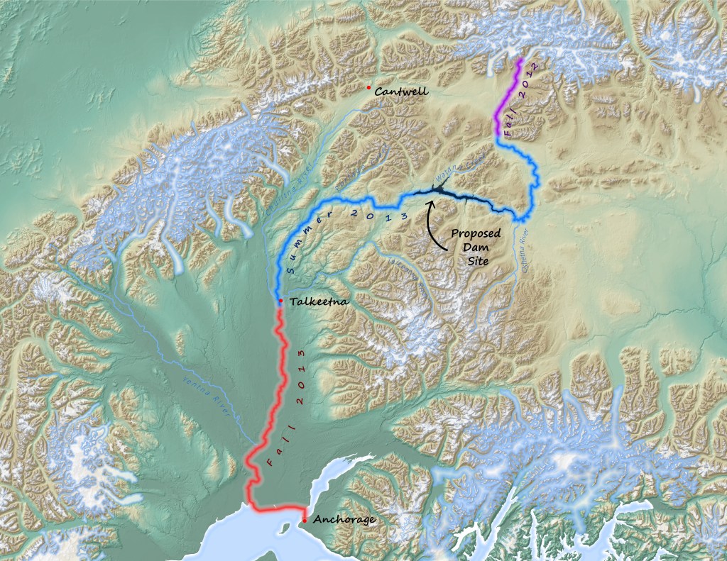 Which leads into another reason that part of the Susitna River is somewhat well-known: Proposed hydroelectric projects for the area have been studied in the 1960’s and the 1980’s and the early 2010’s. Most recently, support faded in 2014 when the funds for the studies dried up, but the subject continues to be floated in certain circles from time to time. The project as it currently stands would build a 705 foot tall dam and a 44 mile long reservoir on an anadromous salmon stream.