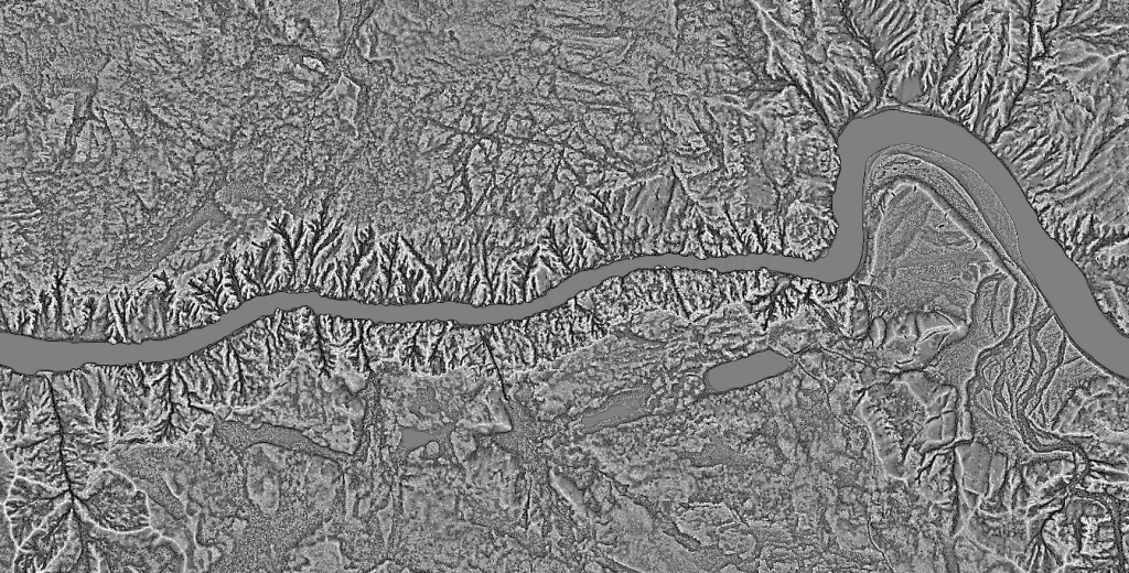 The second part of RRIM that can be mimicked is through blend modes. It isn’t exactly clear in the original RRIM paper how the slope gradient and openness index was “merged”, but it is clear that some kind of blend mode or bivariate symbology was used. The relatively new Blend modes in ArcGIS Pro allow me to accomplish that same look by blending slope gradient and the curvature raster.