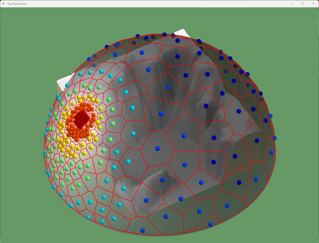 I then used that information in the Sky Luminance program that comes with the Terrain Tool. The Sky Luminance program creates a dome meant to represent the sky, and then allows a user to choose from a bunch of different sky models, as well as alter the light source’s azimuth and elevation. Once the user is happy with the model and light source location, the program will then create a lot of points meant to represent the direction of illumination, weighted by algorithms determined from the sky model the user chose. The user then saves the attributes for each point in a text file.