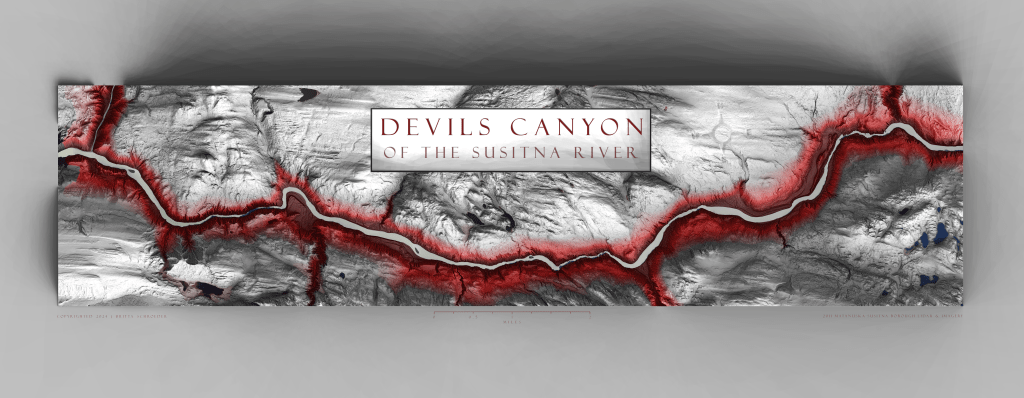 In 2012/2013, a former co-worker of mine, Chris Dunn, paddled the entirety of the Susitna River alone, portaging parts of Devils Canyon. He documented his 300+ mile journey and wrote an very detailed, very interesting 3-part series for the Ground Truth Trekking blog. My interest in his travels led me to make the map that accompanies his story (my first real map for “hire” – be kind!).