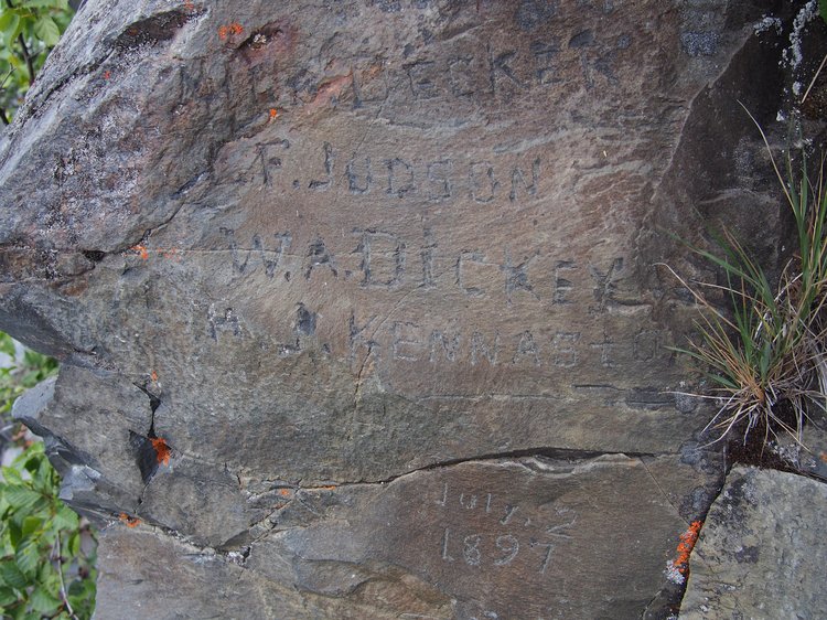 In my mind, the Susitna River – specifically Devils Canyon – is also tied to another story of legendary status in Alaska. In the late 1890’s, a gold prospector named William Dickey traveled throughout the Susitna River drainage. Dickey’s tie to Devils Canyon came when his party traveled up the Susitna River but could not find a way to portage the canyon, so had to turn back. Before they left the area, they made their indelible mark on a rock at Portage Creek, which is still there to this day.