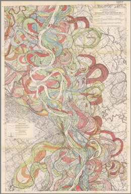 There is a well-known historic map that often appears in art books and online forums as a beautiful example of what might otherwise be a dry topic: the Geological Investigation of the Alluvial Valley of the Lower Mississippi River, published by Harold Fisk for the U.S. Army Corps of Engineers in 1944. The maps that accompany the report show the Mississippi meander belt with overlapping colors and lines, and drive home the point that rivers are ever-changing entities and maps are a form of art.